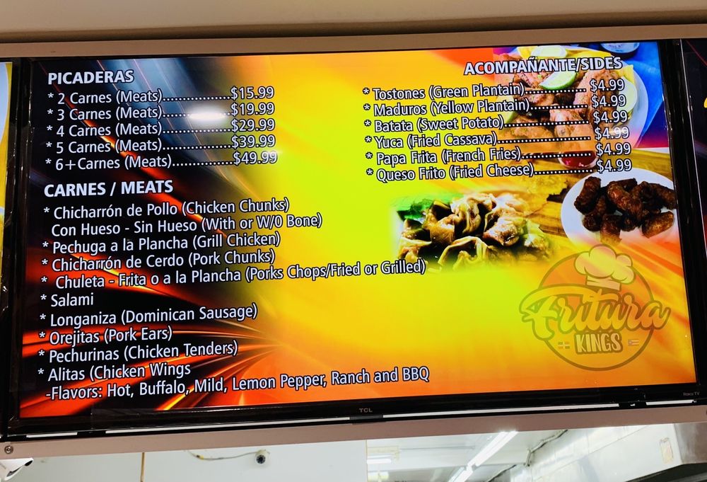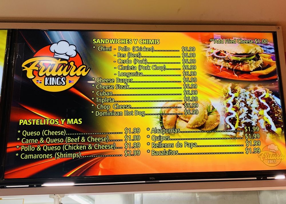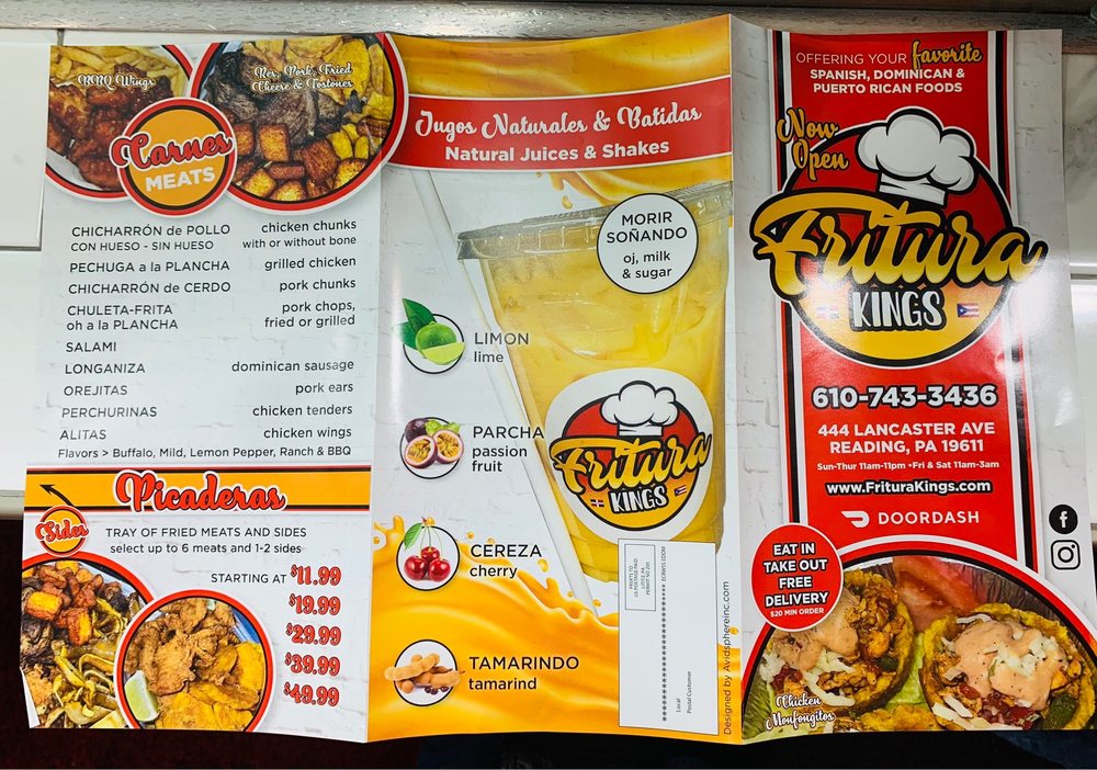 Introducing the menu at Fritura Kings, a Spanish cuisine gem in Reading, PA. This unclaimed restaurant offers delivery, takeout, and ample parking for customers. Indulge in their signature Patacon Sandwich with a choice of meat, American cheese, and fresh toppings at $16.99. Try the mouthwatering Chimi Sandwich for $10.40 or the savory Tripleta Sandwich with pork, chicken, and ham for $12.99. Feast on their Picaderas platters that can feed a crowd, starting from $16. And don't miss out on their flavorful Mofongo dishes like Pollo Mofongo and Camarones Mofongo, priced between $16.99 to $20.99. Customer reviews rave about the friendly service, generous portions, and homemade taste at Fritura Kings. With a bustling atmosphere and authentic flavors, this spot is a must-visit for lovers of Puerto Rican and Dominican cuisine.